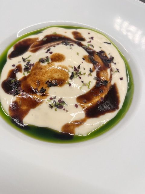 Ground-ried egg, potato foam with herbs, sautéed wild mustard leaves, vegetable stew