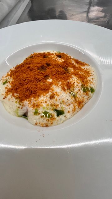 Yellowtail tartare, organic daikon foam, yoghurt, crispy raspberry, tomato powder