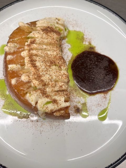Slice of CBT pumpkin, salted pumpkin caramel, cauliflower and hazelnut sauce, vegetable fond